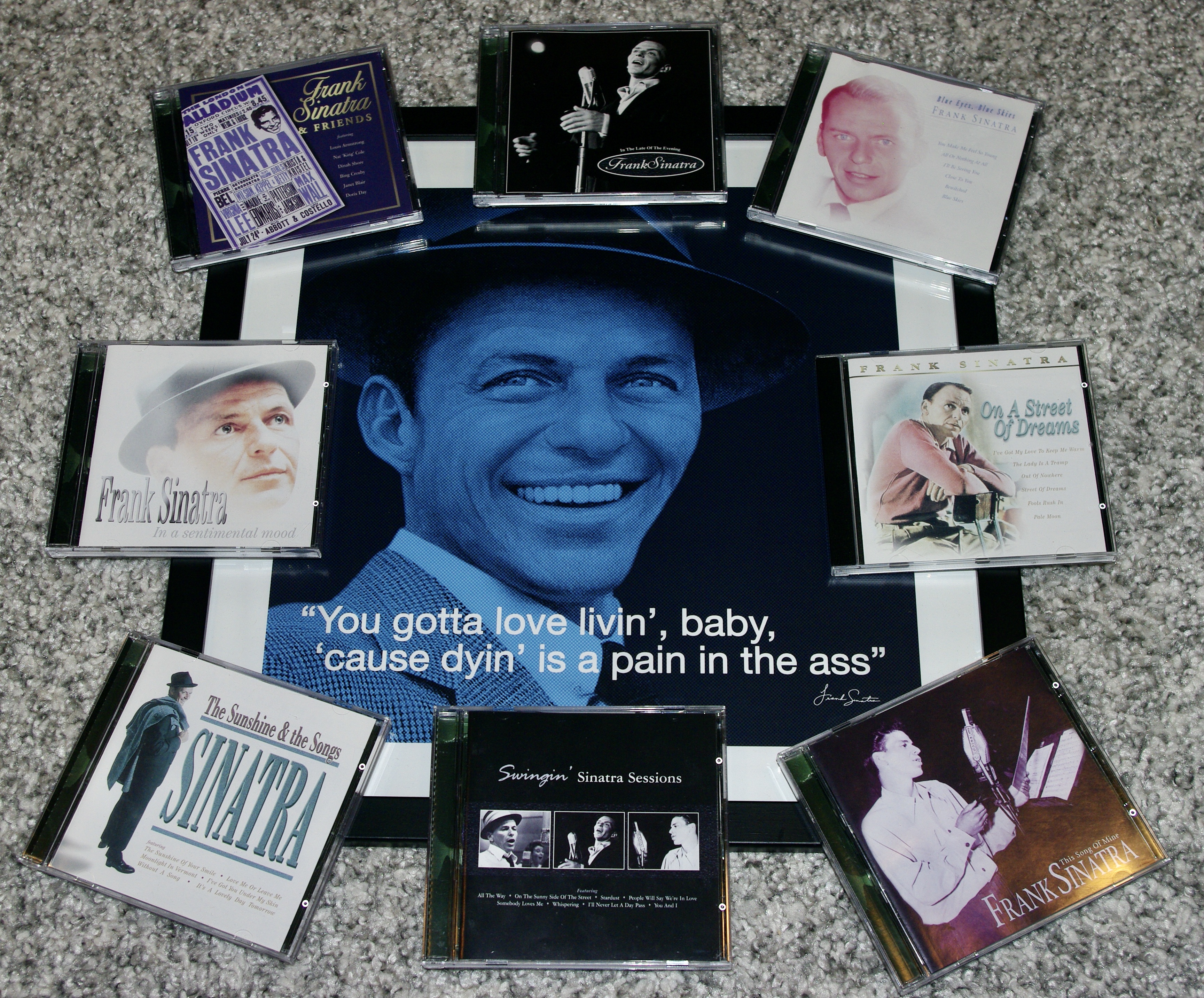 From own collection, framed poster, source is ‘”iQuote” famous icons/famous quotes’ and Frank Sinatra CD’s with detailed source information via discogs link below.
