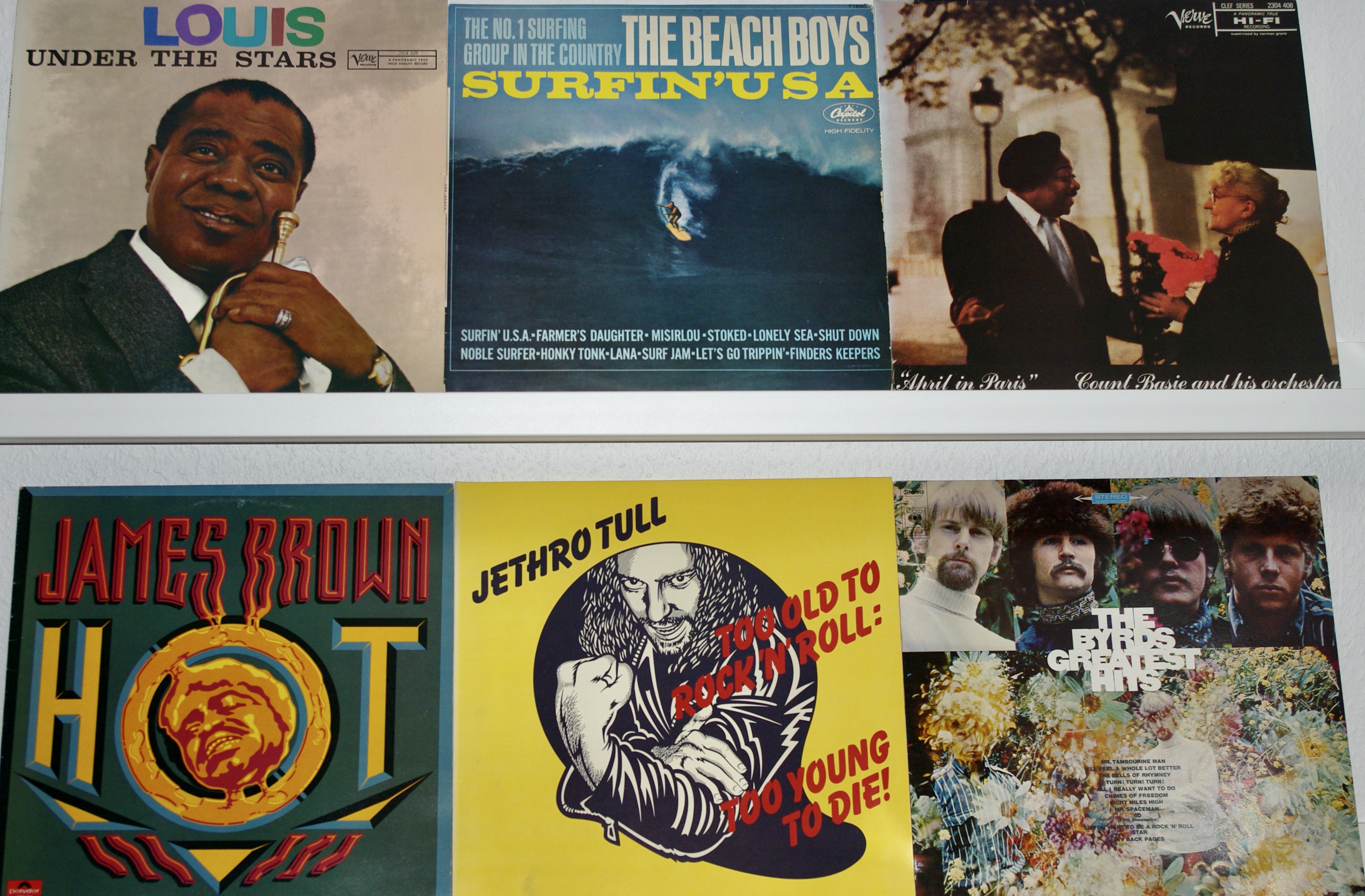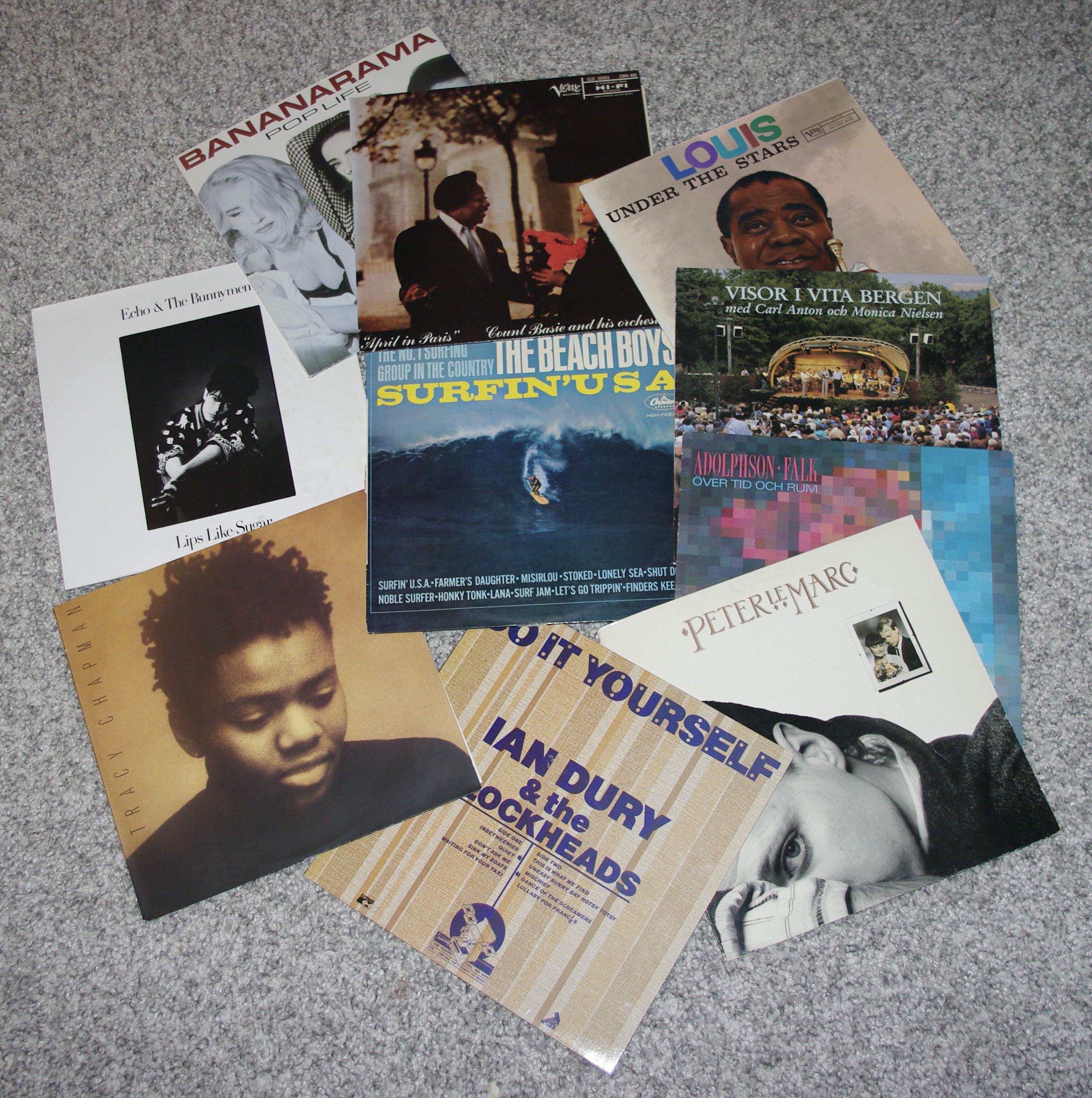 LP’s from own collection. Swedish: Peter Le Marc, Adolphson & Falk, Carl Anton/Monica Nielsen. Non-Swedish: The Beach Boys, Ian Dury & the Blockheads, Louis Armstrong, Count Basie, Bananarama, Echo & The Bunnymen. Tracy Chapman.