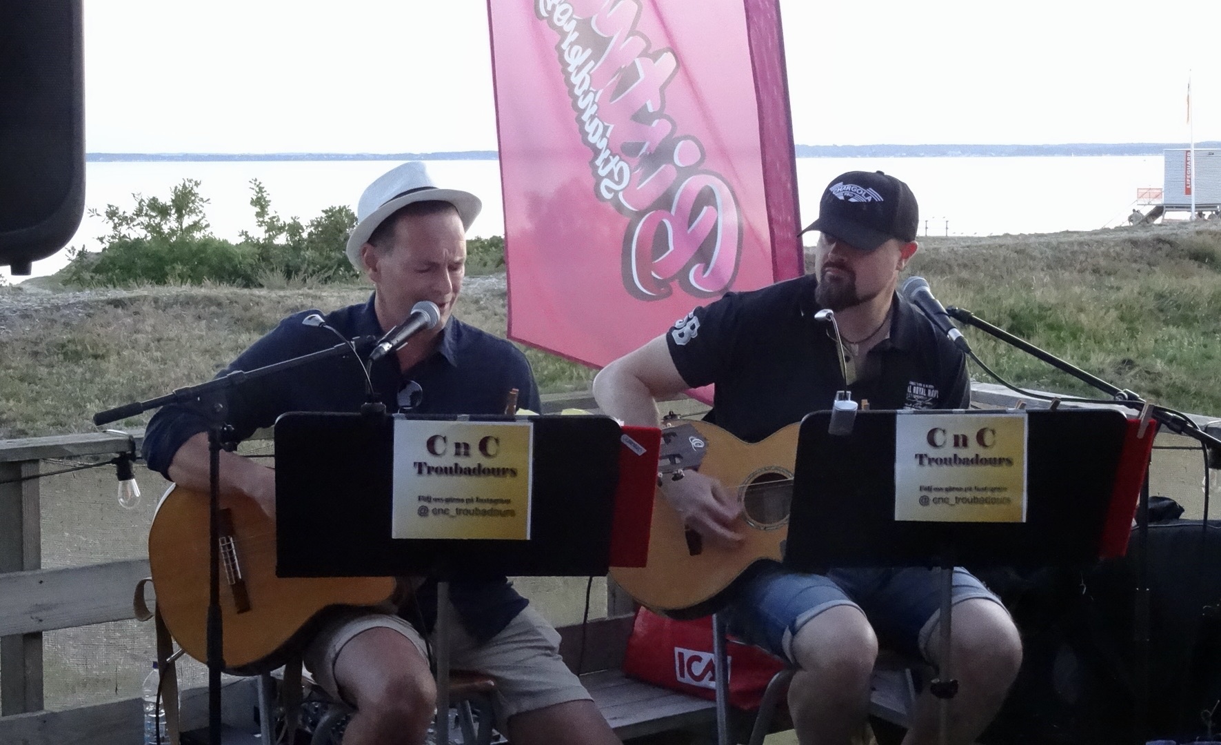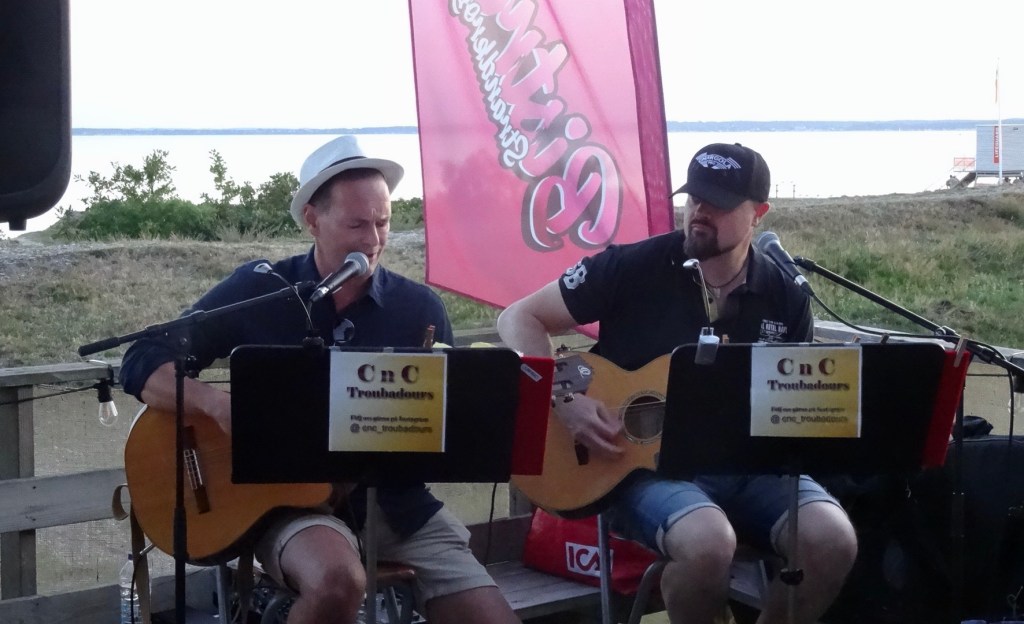 Christian Thornblad and Christoffer Malmström (an all time metalsouth favourite, please, see other posts of ‘Darkane’) enlightened an already sunny evening with a wide variety of songs like ‘Does your mother know’ (ABBA),’I saw her standing there’ (Beatles), ‘Flickan i en Cole Porter Sång’ (Gyllene Tider) and ‘Kung I Baren’ (Magnus Uggla). Really high quality singing and guitar playing made eating guests at the Bistråå Strandkrog & Minigolf on Friday July 28, 2023, finish their meals quickly in order to get up there and dance…and sing!