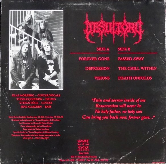 In order to return to our roots we are also happy to post a Swedish death metal rarity from Desultory – Forever Gone (House of Kicks, HOK, 1992) at our Discogs seller page. Desultory was part of the Swedish death metal origins in the beginning of the 1990’s (source: Wikipedia). Entombed from this era and Entombed A.D. are other favorites at metalsouth and can here be studied further. The used Forever Gone album’s condition is described, priced and with shipping terms at: